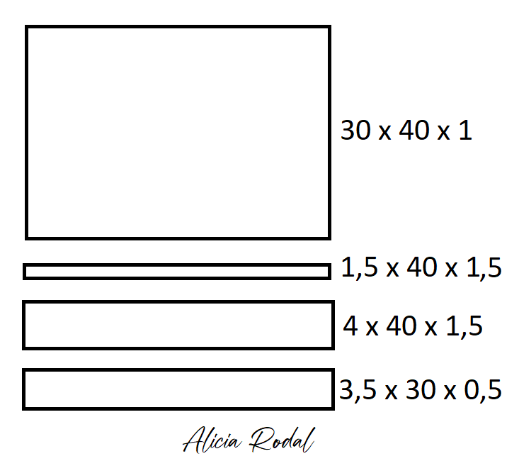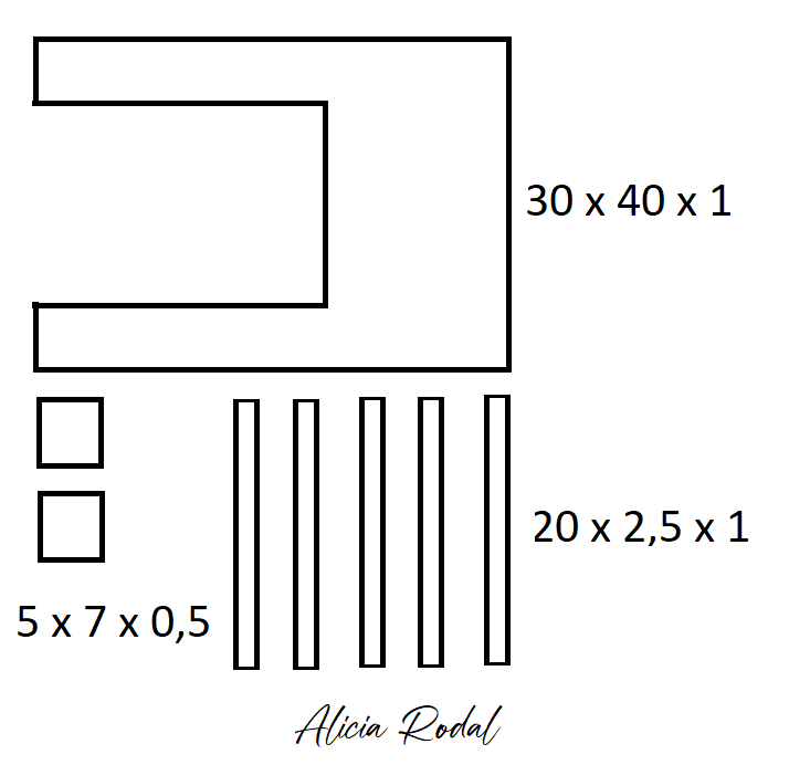 - Por detrás 1 pieza: 4 x 40 x 1,5 y 1 pieza: 3,5 x 30 x 0,5