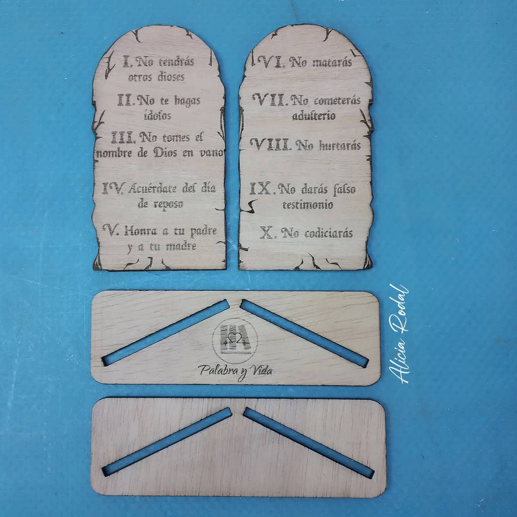 Hoy quiero compartir contigo el proceso completo de creación de un encargo muy especial: unas tablas de Moisés realizadas en madera, cuidadosamente trabajadas para simular la piedra, con los Diez Mandamientos grabados a láser y detalles personalizados según las indicaciones de una clienta apasionada del arte único.