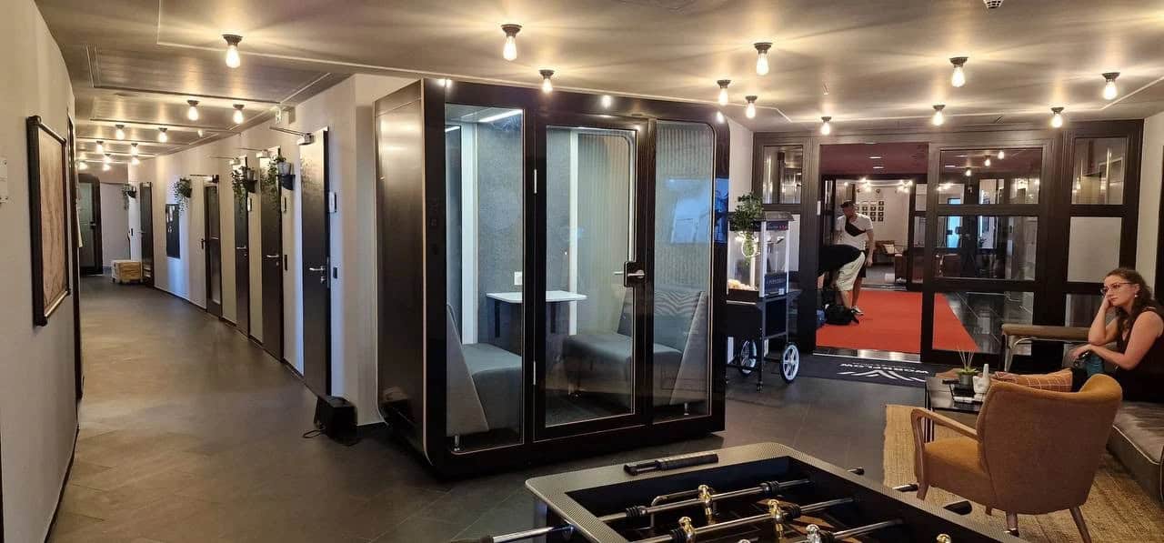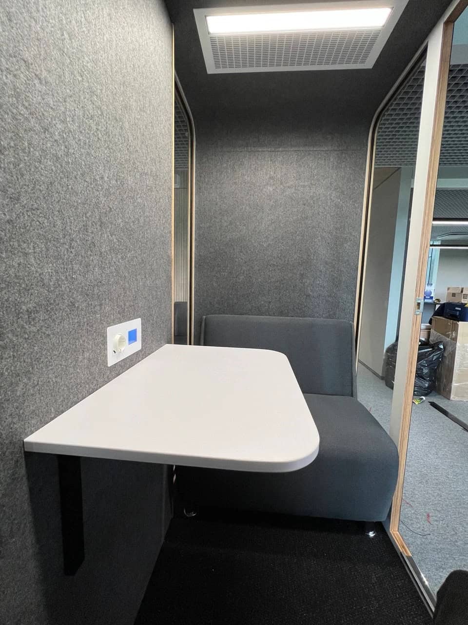 - Duet: 2 personas | 210 × 110 × 220 cm | 35 dB | Ventilación 90 m³/h con silenciadores | LED con sensores | 1×220 V + 2 USB | Mesa + sofás | Uso: entrevistas, 1:1, co-creación breve (cabina insonorizada de reuniones).