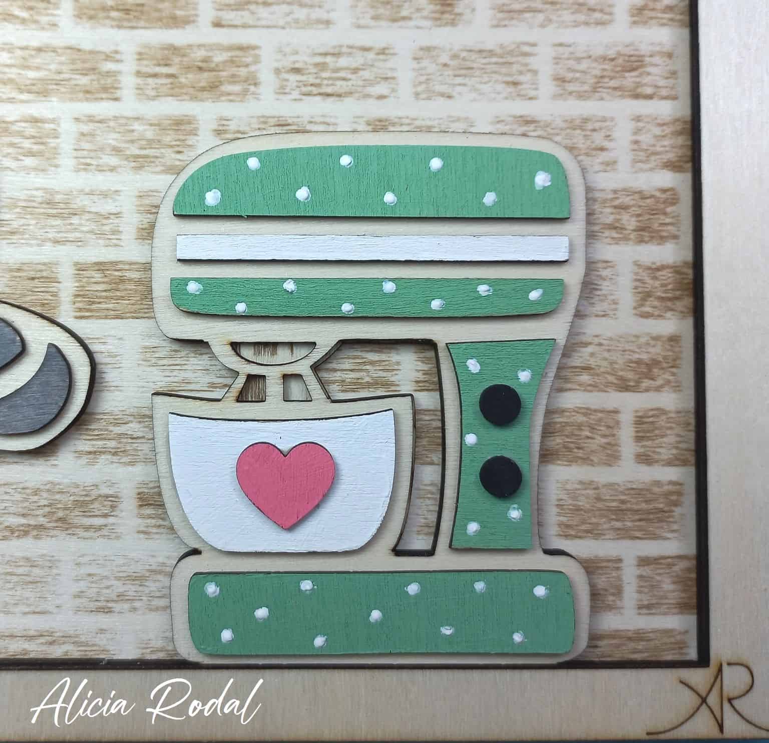 Dentro del cuadro, he representado una tarta de dos pisos sobre un pedestal, el símbolo por excelencia de la repostería festiva, junto a una batidora eléctrica, indispensable en cualquier obrador moderno.